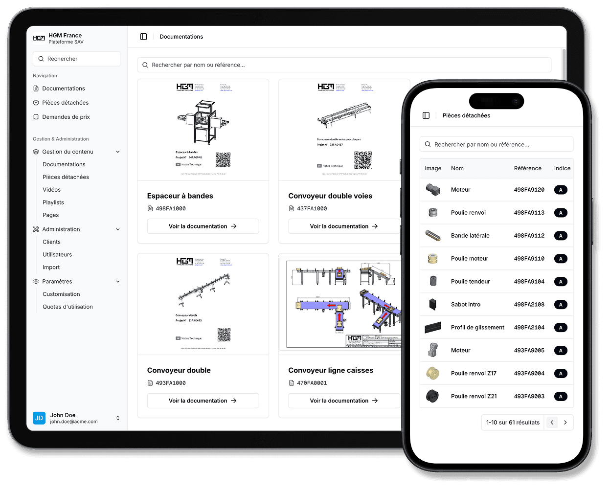 Vous contrôlez précisément quels documentations et pièces détachées sont visibles par chaque client.